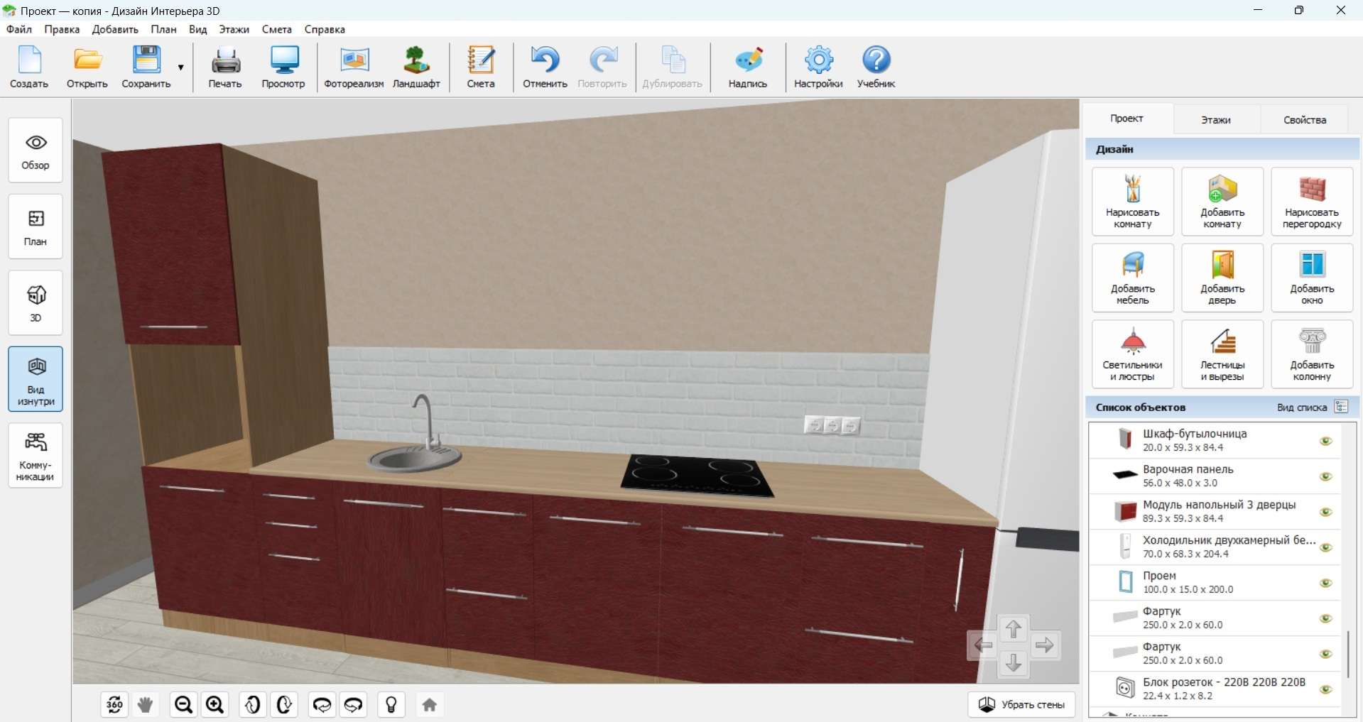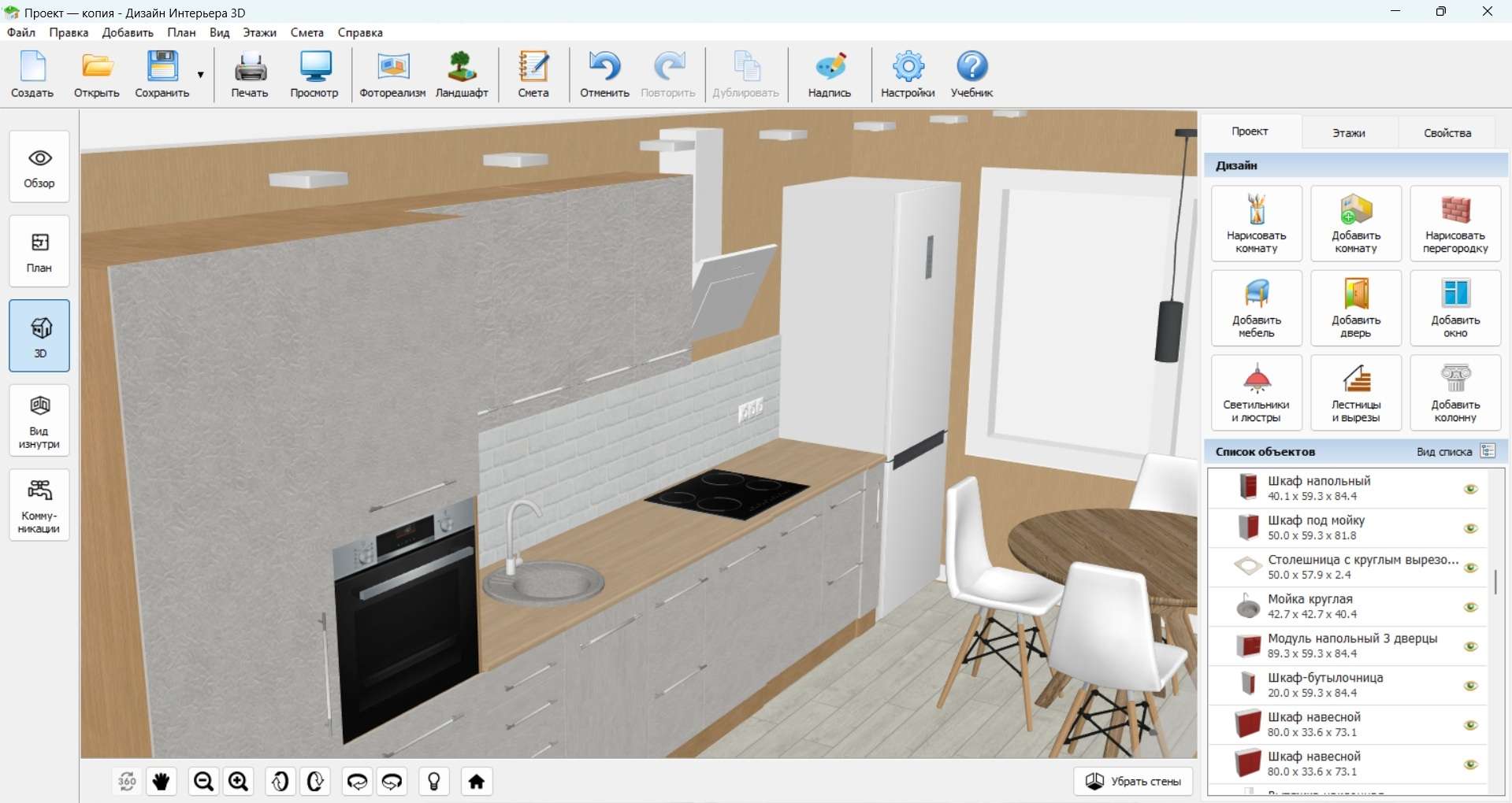 Поможет в этом программа для создания кухни с размерами такая, как Дизайн Интерьера 3D. В ней есть каталог мебели и материалов, инструменты для расчета расстояний, визуализация интерьера в 3D и составление сметы.
