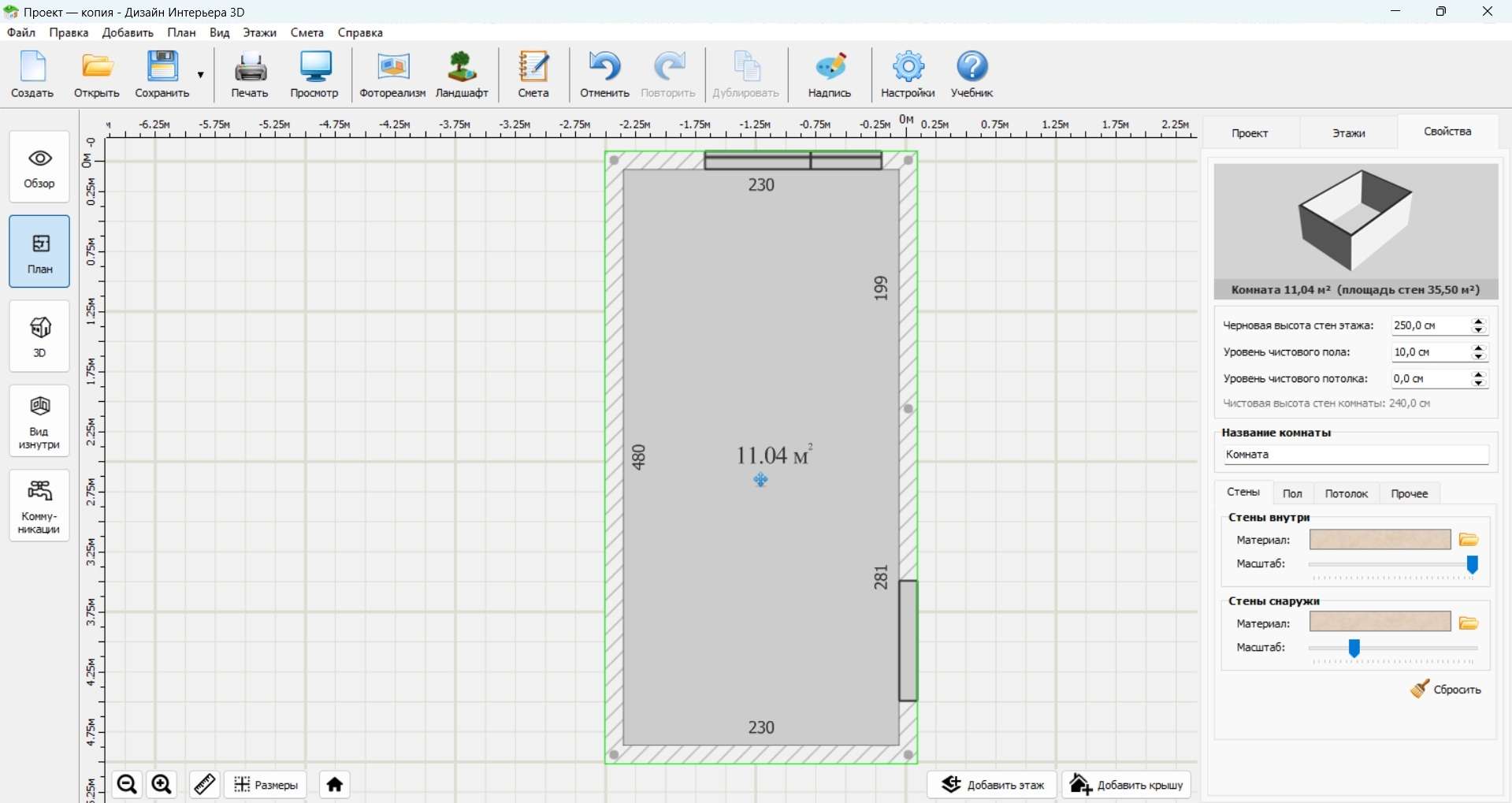 Затем воссоздайте эти параметры в программе: кликните по инструменту «Нарисовать комнату», задайте длину и высоту, добавьте проемы. Все интуитивно, как в 3D-конструкторе.