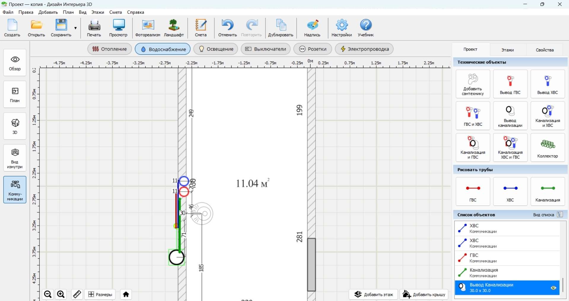Дизайн Интерьера 3D не моделирует инженерные сети в профессиональном формате. Но чертежи помогут объяснить сантехнику и электрику, что и где должно быть, а вам самим грамотно спланировать интерьер с учетом коммуникаций.