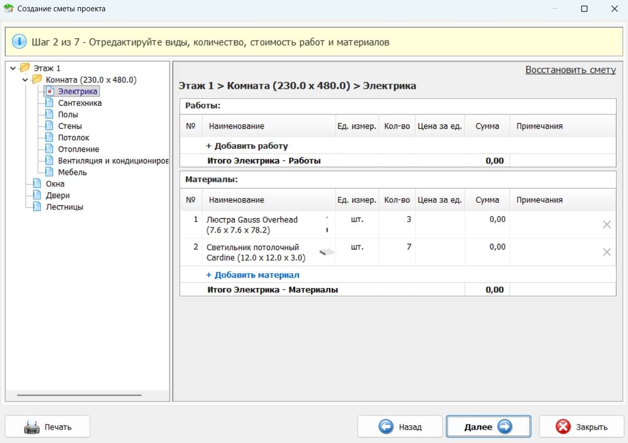 Для тех, кто планирует закупку материалов, программа для планировки кухни также формирует смету. В ней указаны объемы напольного покрытия, плитки, перечень мебели и даже стоимость работ. Распечатайте документ и используйте в дальнейшем как чек-лист. Так вы точно не купите лишнего и не забудете про важные мелочи.