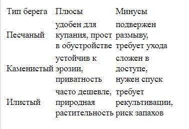 Песок обеспечивает мягкий вход в воду и меньше работы с очисткой пляжной зоны, зато он подвержен размывам при подъёме уровня. Каменистые прибрежные полосы устойчивы к эрозии, но требуют обустройства лестниц или террас для доступа. Илистые участки часто скрывают топкие места и донные отложения, что создаёт запахи и сложность в поддержании чистоты. Важно запросить анализ воды на бактериологию и содержание нитратов, особенно если планируются дети или приготовление пищи возле воды. Ниже – сравнительная таблица основных типов берегов и их характерных свойств:
